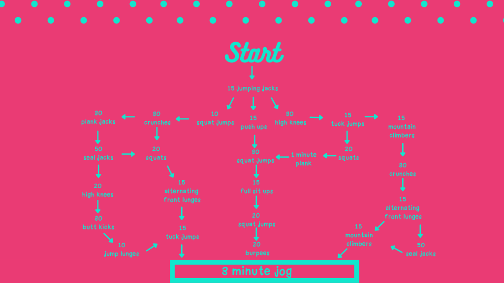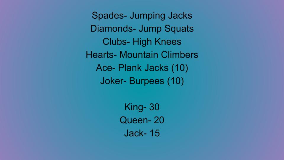 Have students draw cards. Each card corresponds to an exercise. For example, if they draw a 8 of diamonds they would do 8 jump squats. If they draw a king of any suit it’s 30 of that exercise so on and so forth. You can change this activity in so many ways!