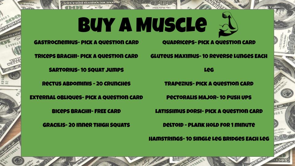 This was really fun! I set up an area like I was a “bank” and they had to come to me to purchase each muscle. I had them designate one person to be the person they labeled, but made sure they had that person label themselves so there was no touching going on. That person was the only one exempt from the activities. The others in the groups had to buy the muscles with the activity or answering the questions. I had about 4-5 groups per class. When a group thought they were done I would go check and have them unlabel the things that were wrong. I didn’t use all the muscle names (like the ones for quads, hamstrings) instead I just had them use Quad’s/Hamstrings since I didn’t think that would remember vastus lateralis etc π I could be see this being super fun if I had made a sign for the bank and dressed up like a banker or something too!