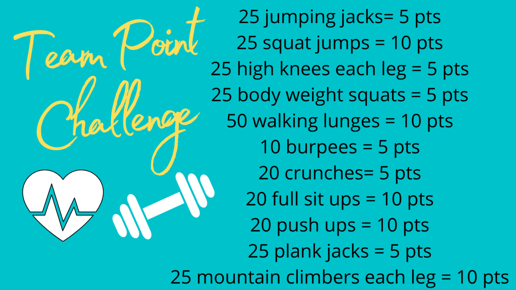 If you are interested- I have a bodyweight, cardio, and weights version up on my TPT! https://www.teacherspayteachers.com/Product/Bodyweight-Cardio-and-Weights-Team-Point-Challenge-7576602
